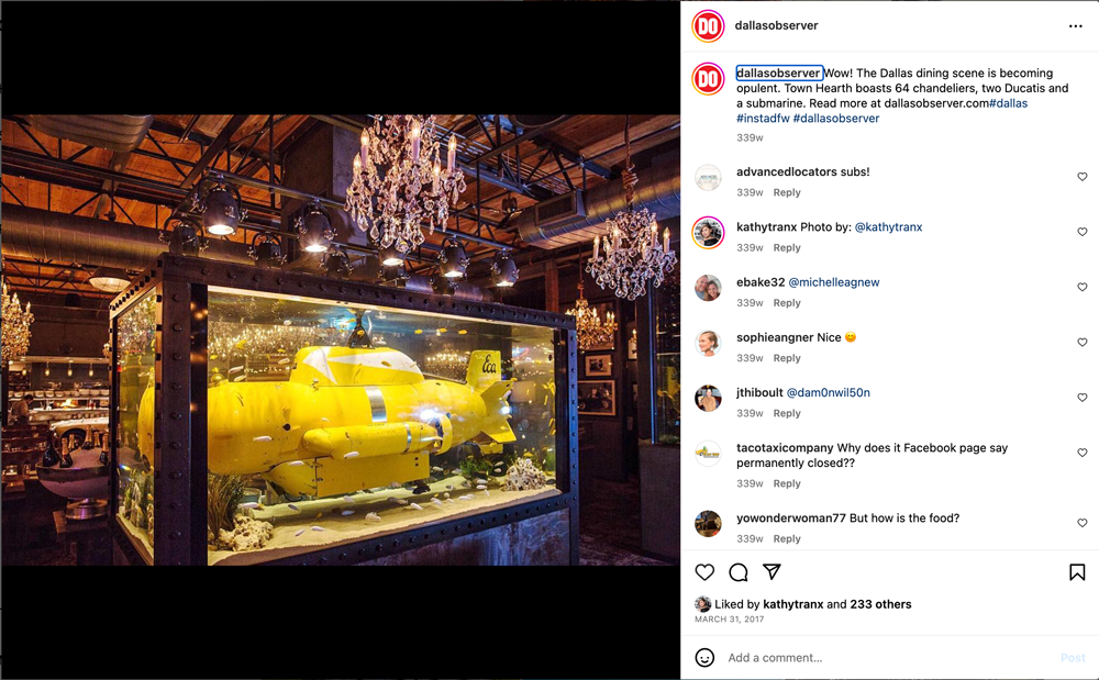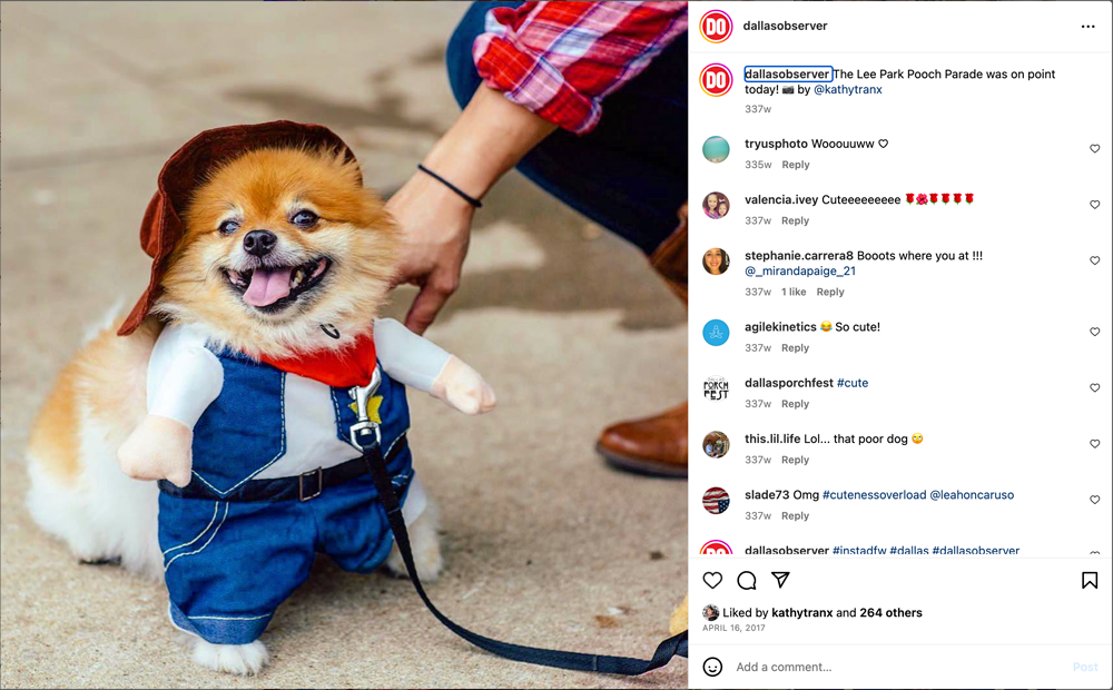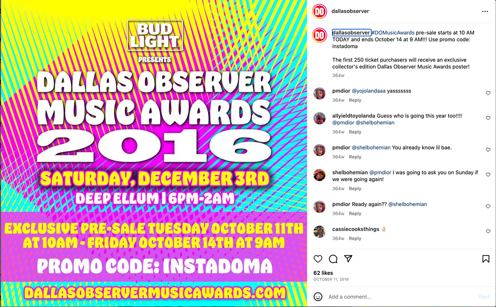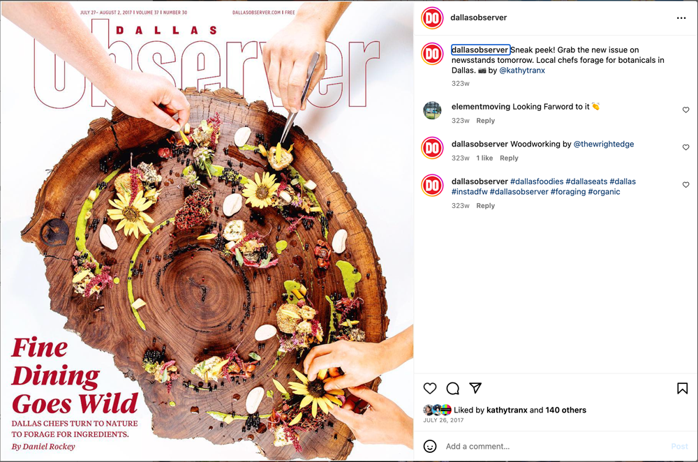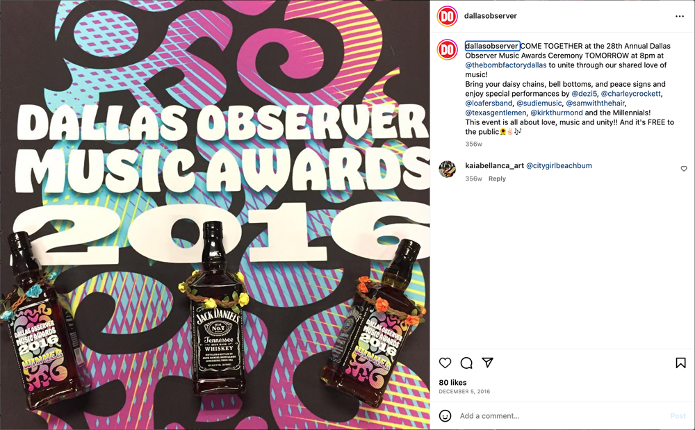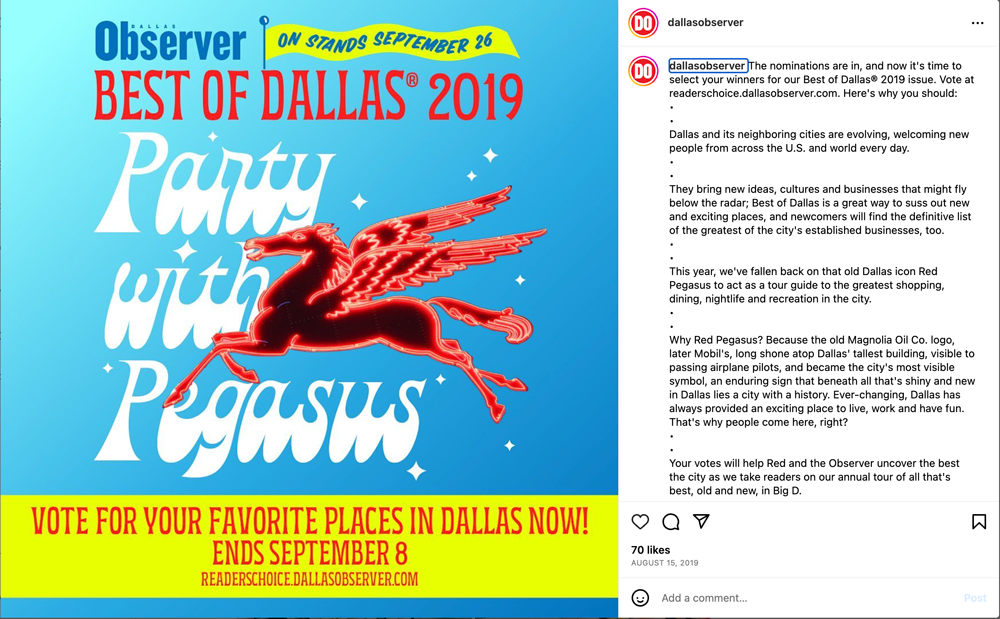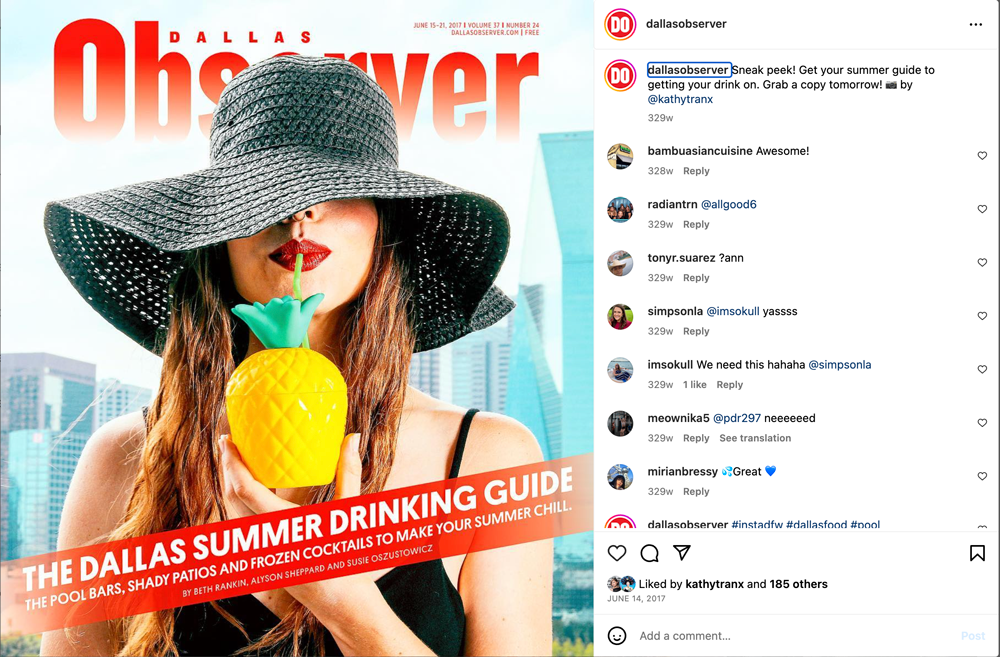As an editorial designer at Voice Media Group, I shot photos, hired photographers and curated photos, created graphics, wrote content, and built a fun social media persona and built community through VMG’s Dallas Observer Instagram account. For most of the following posts, I wrote the content, but hired photographers to shoot the ads or events and then selected and edited photos for use on the various VMG platforms.
